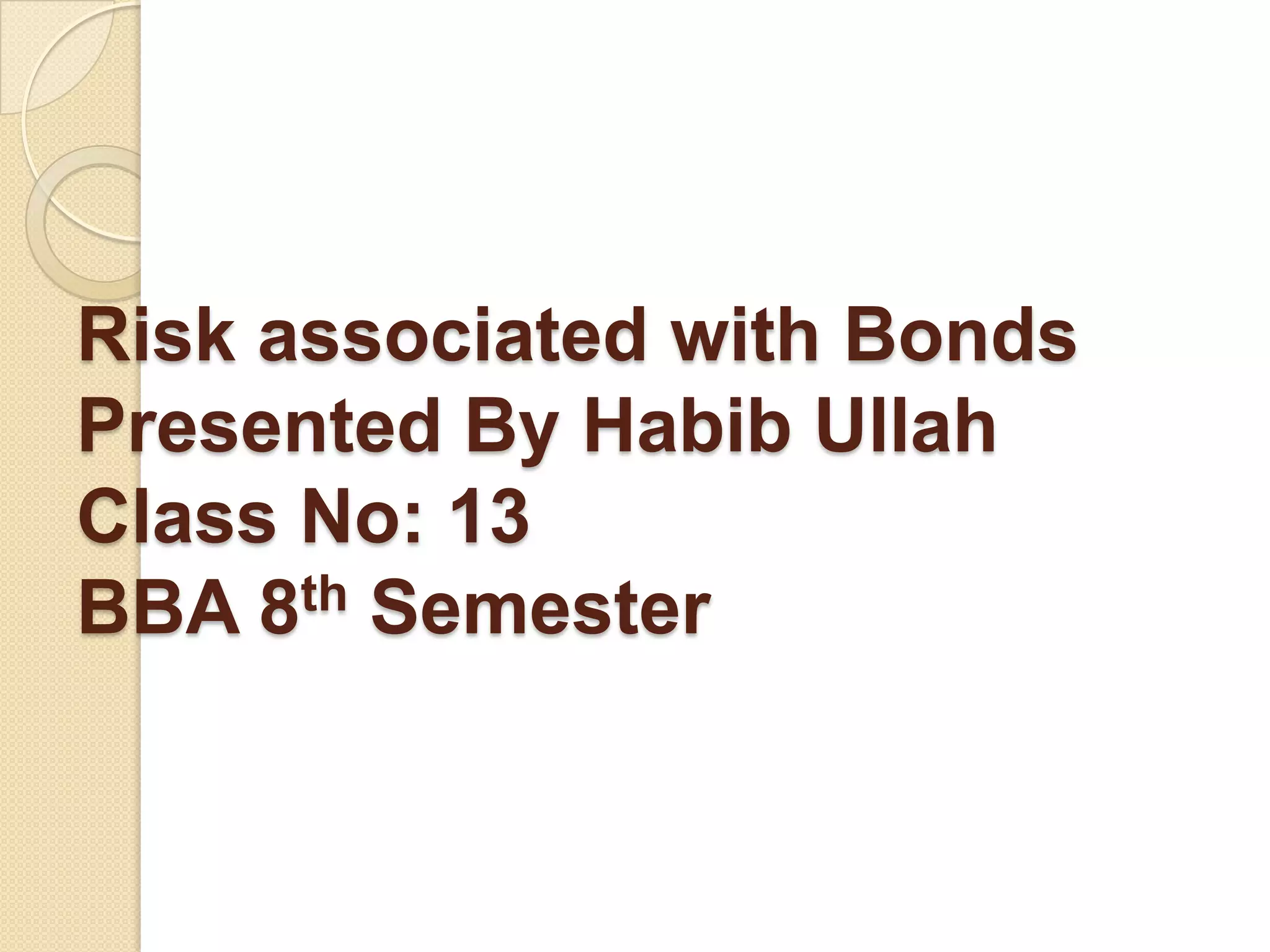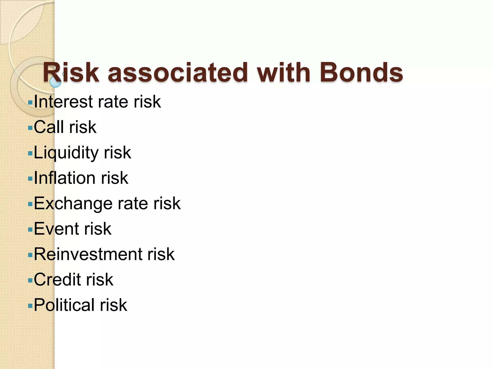 The document outlines several types of risks associated with bond investments: 1) Interest rate risk, inflation risk, reinvestment risk, and credit risk pose the greatest threats as they relate to changes in rates that can decrease bond prices or the value of future cash flows. 2) Call risk, liquidity risk, and event risk also impact bond holders, such as the bond being paid off early, difficulty selling the bond, or external events negatively affecting the issuer. 3) Investors in foreign bonds face additional exchange rate risk if the foreign currency fluctuates against the domestic currency.