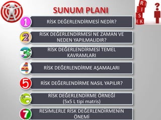 Firma çalışanlarının riskin ne olduğu ve şirketimizde risk değerlendirmesinin nasıl yapıldığı hakkında bilgilendirmek amacıyla, en temel kavramlar üzerinden oluşturulmuş bir sunum.