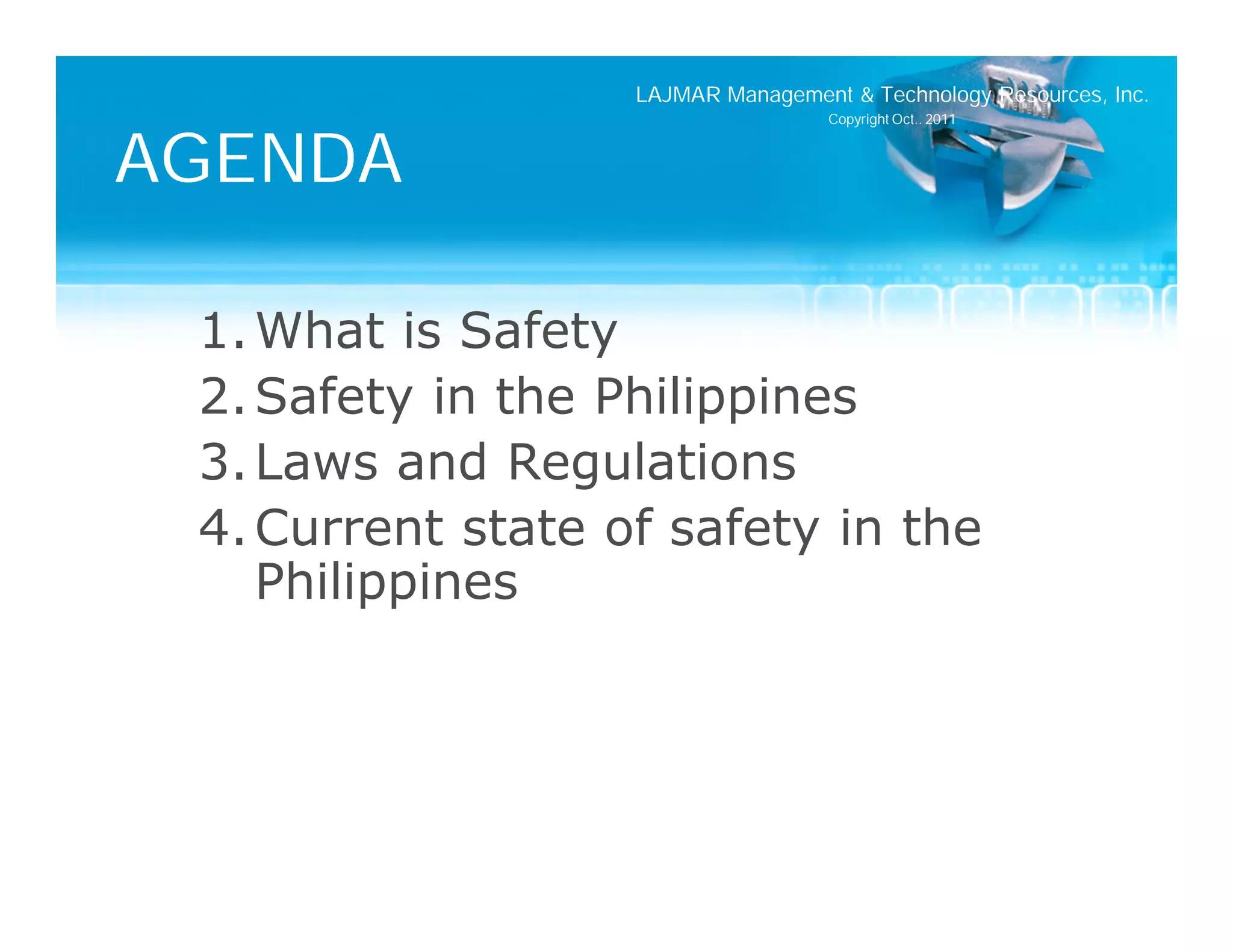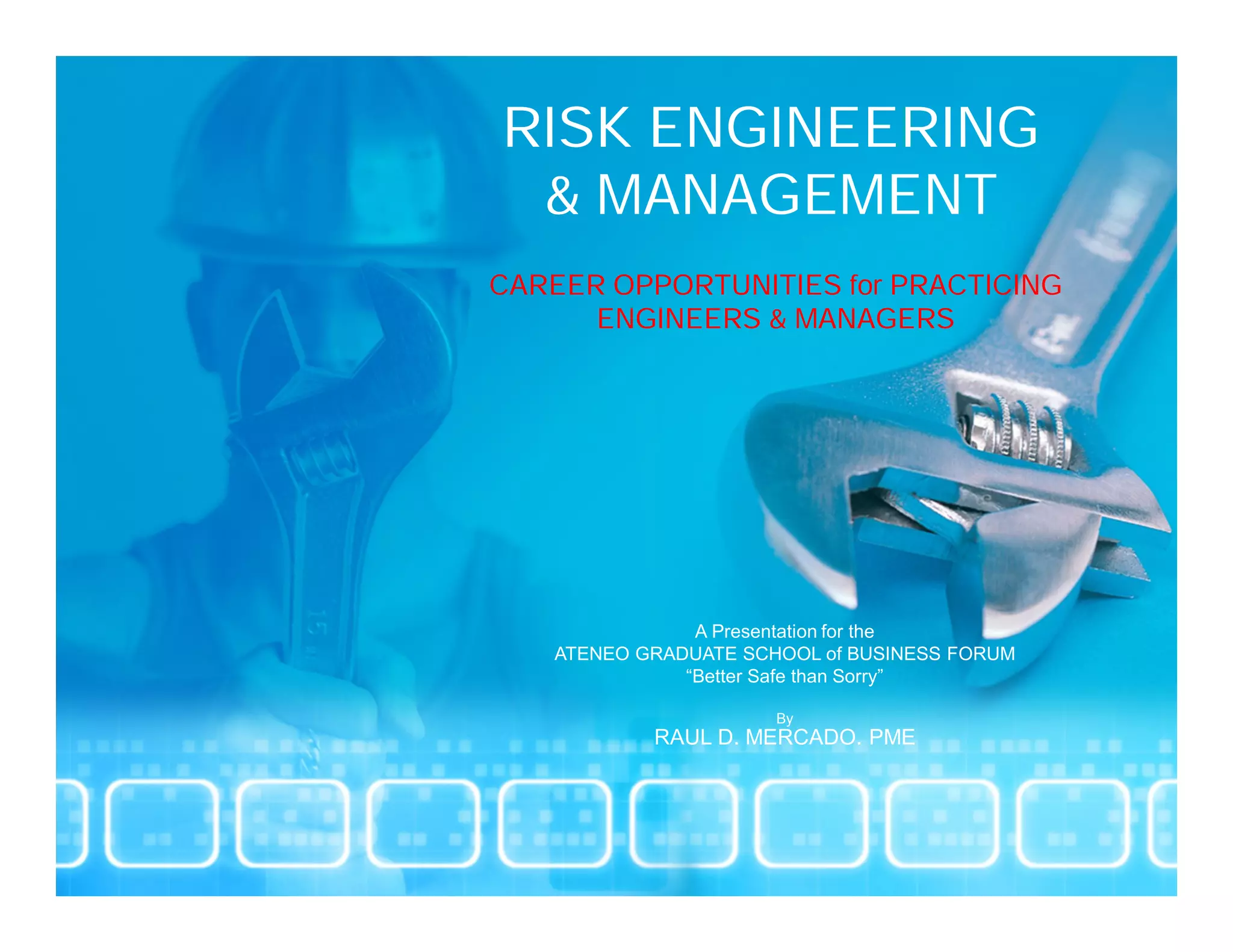 The document outlines career opportunities in risk engineering and management for engineers and managers, emphasizing the importance of safety within various industries, particularly in the Philippines. It highlights historical incidents that prompted a greater focus on safety legislation and processes, while discussing safety management techniques and frameworks. Additionally, it reviews existing safety standards and food safety regulations in the Philippines, along with recommendations for improvement.