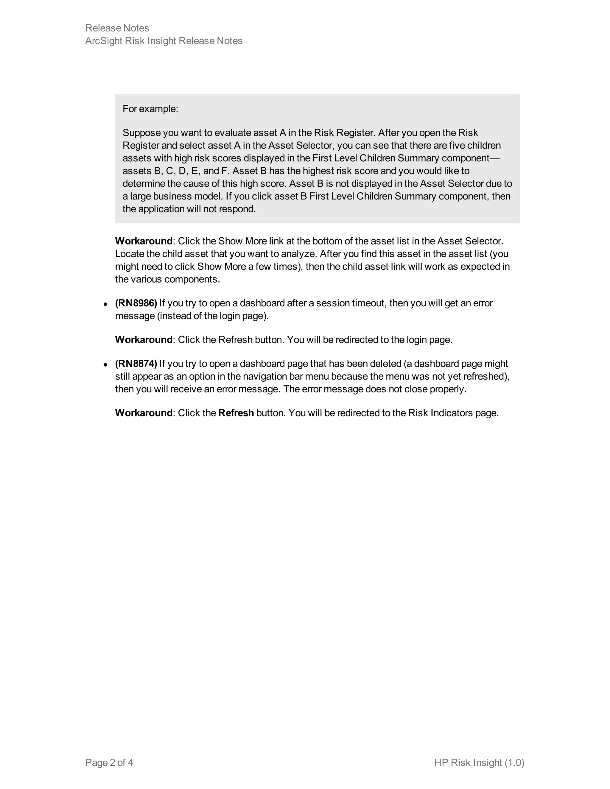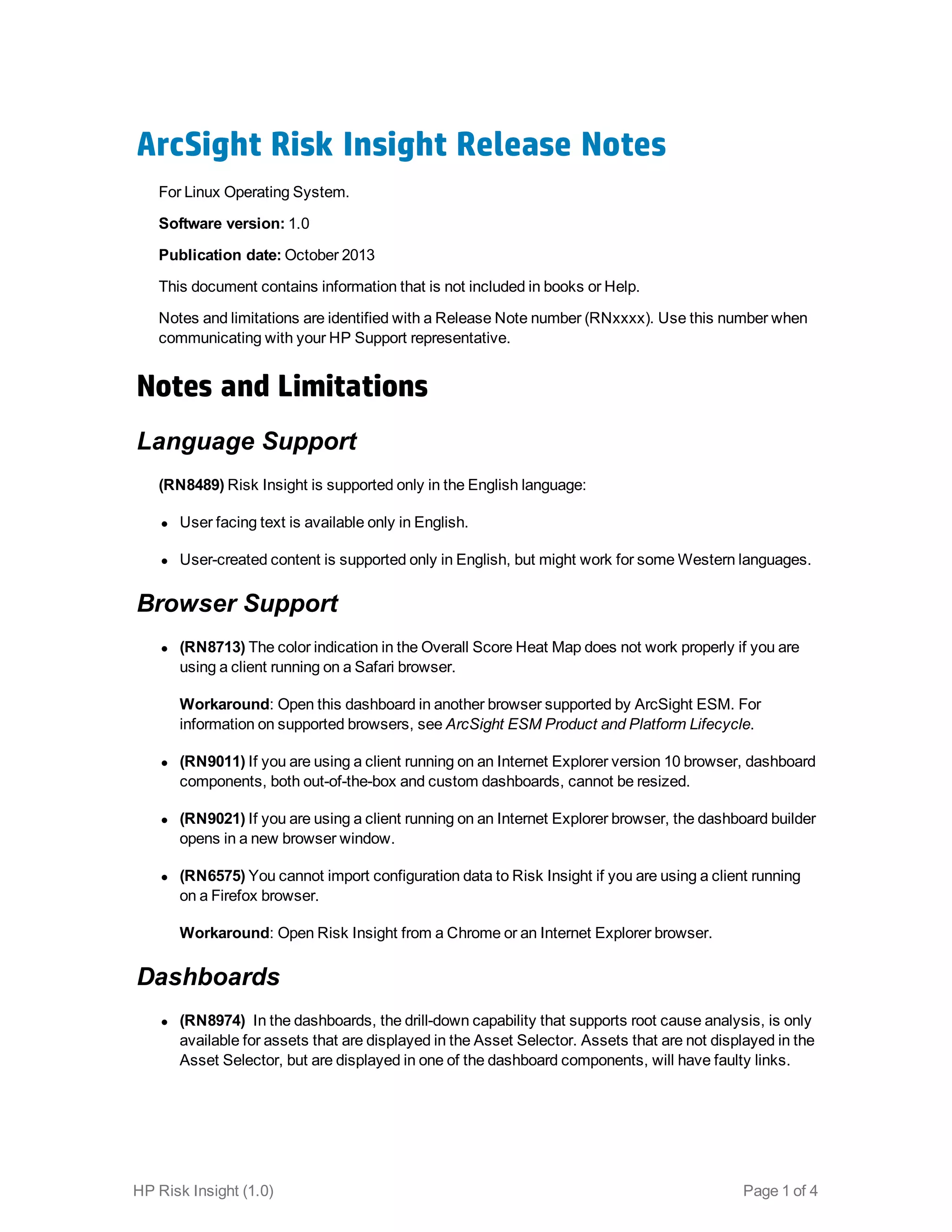 This document contains release notes for ArcSight Risk Insight version 1.0 from October 2013. It notes that the software only supports the English language and certain browsers. It also describes limitations and workarounds for issues with dashboards, drill-down capabilities, session timeouts, and deleted dashboards. Support information is provided.