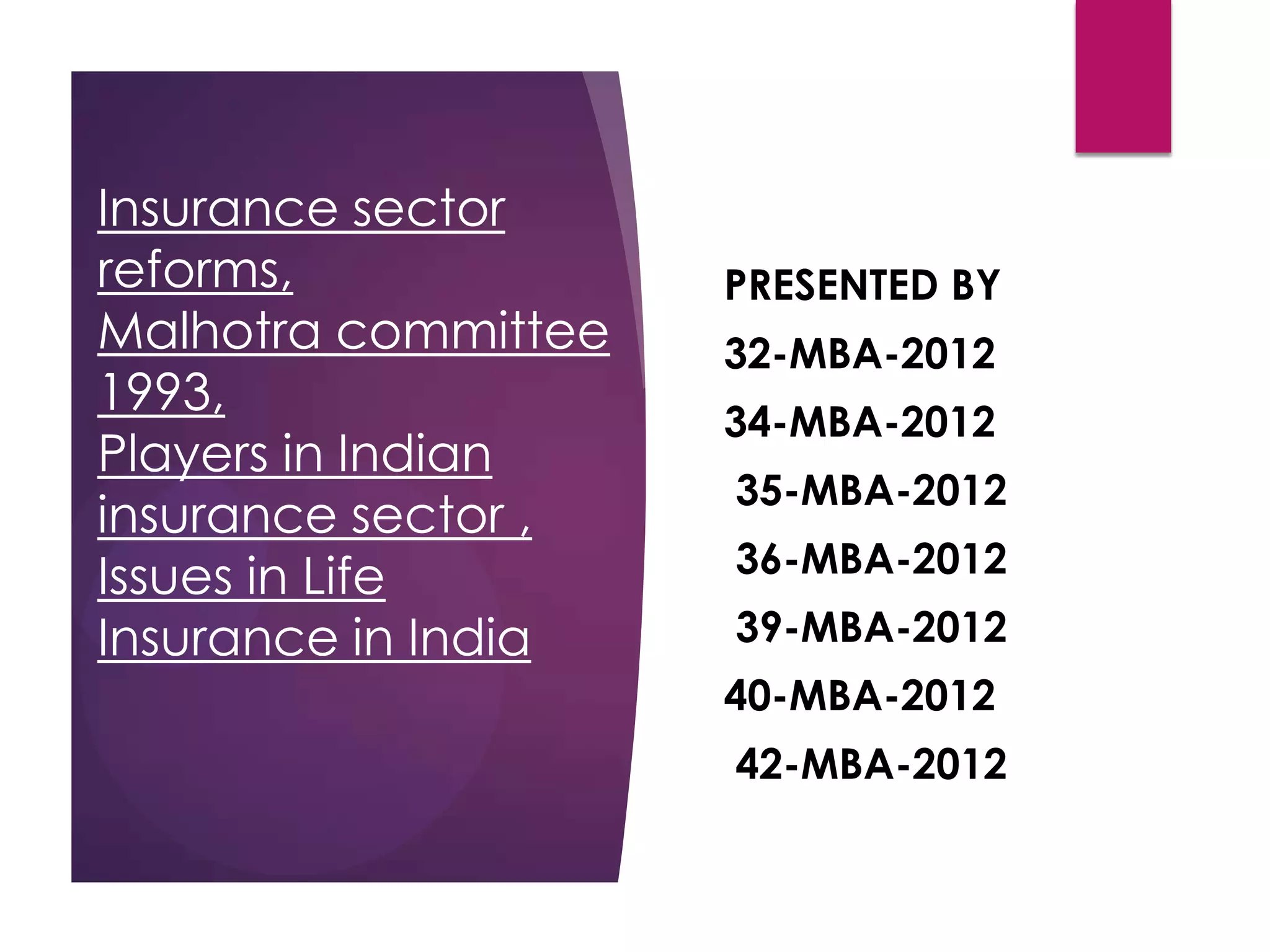 This document discusses the insurance sector in India. It provides background on insurance sector reforms and the Malhotra Committee of 1993. It then discusses the key players in the Indian insurance sector and some issues facing life insurance in India, including the need to raise foreign direct investment limits, high expense ratios for private players, strengthening core product offerings, delays in profitability for private insurers, lack of professional agency channels, promoting bancassurance, and other global issues impacting insurance. The document provides an overview of the current state and challenges within the Indian insurance industry.