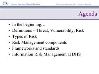 This document summarizes a presentation on risk management 101. It defines key terms like threat, vulnerability, risk, and types of risk. It outlines the components of risk management frameworks including identifying threats, assessing risk, evaluating options, and taking action. It discusses different risk management standards and frameworks. Finally, it provides an overview of information risk management practices at the Minnesota Department of Human Services.