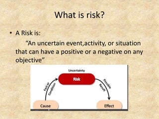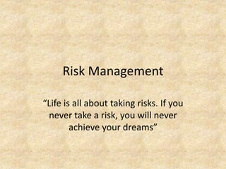 Risk management is the process of identifying, analyzing, and mitigating risks. It involves establishing the context, identifying risks, analyzing their potential impact, evaluating them against risk criteria, treating risks by developing plans to address high priority risks, and then monitoring risks over time as circumstances change. The goal is to balance risks with potential rewards and manage uncertainty. Risk management is widely used in both public and private sectors across finance, insurance, healthcare, government, and other industries and organizations to help achieve objectives and dreams despite risks.