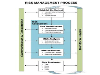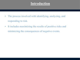 The document outlines the fundamentals of risk management, emphasizing the importance of identifying, analyzing, and responding to risks that can impact projects. It highlights the objectives of risk management, including protecting employees, effective resource utilization, and maintaining good relations with society. Additionally, it discusses the principles, advantages, and disadvantages associated with risk management, noting the need for awareness of potential threats and the costs involved in implementing such strategies.