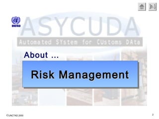 This document discusses risk management and how it is used in customs administrations. It provides an overview of the basic risk management process, which involves establishing the context, identifying risks, analyzing risks, evaluating risks, treating risks, and monitoring and reviewing risks on an ongoing basis. It explains that customs administrations use risk management at the strategic, operational, and tactical levels to help meet objectives like facilitating trade while maintaining control over cross-border movement of goods and people.