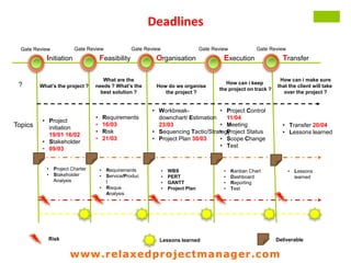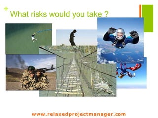 This document summarizes a website that provides information and resources for project managers on risk management. It includes definitions of project risk, descriptions of the risk management process and tips for identifying, prioritizing, and managing risks. Specific topics covered include risk identification techniques, using a risk matrix, the risk register form, and different strategies for responding to risks such as mitigation, transfer, avoidance and acceptance. Flowcharts and diagrams are provided to illustrate risk management concepts and processes.