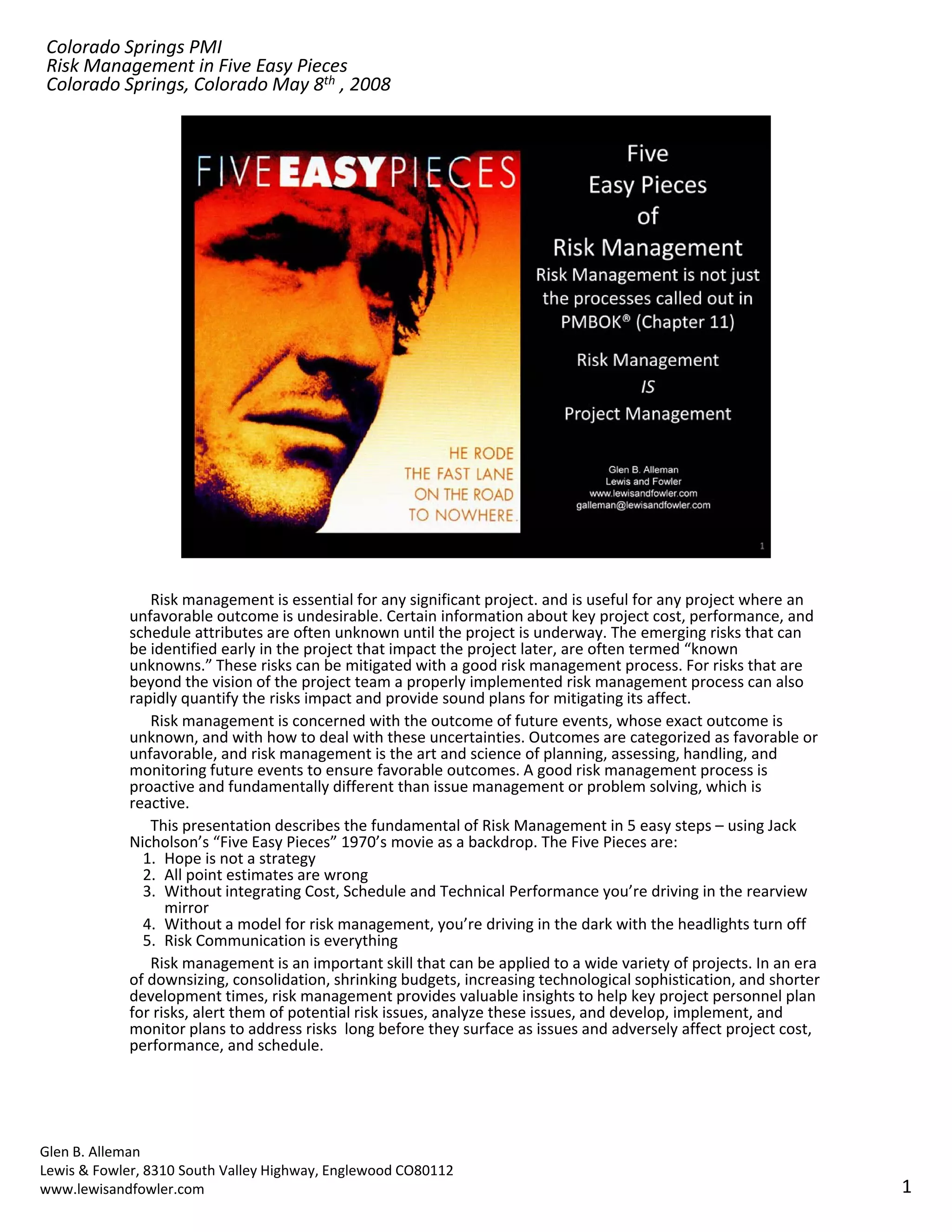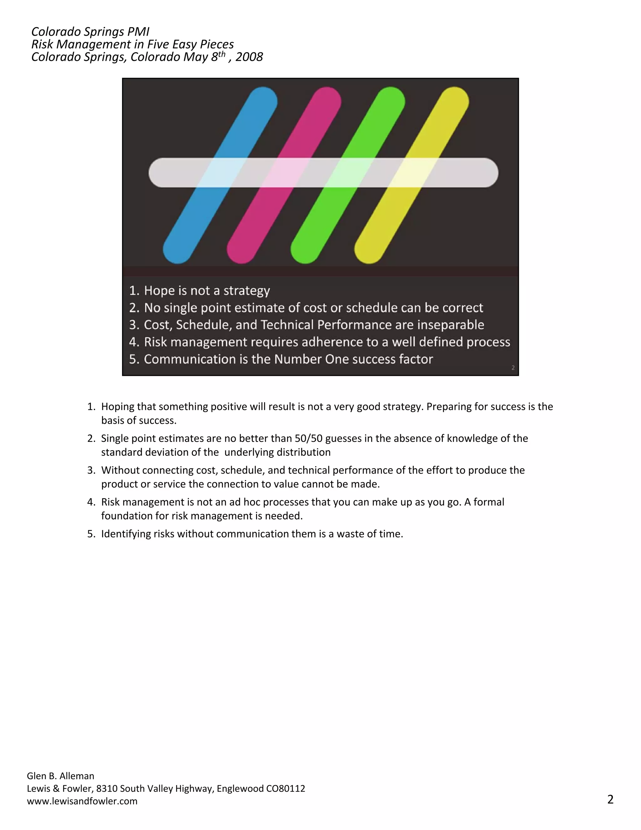 This document summarizes a presentation on risk management in five steps. It discusses that risk management is essential for projects to plan for uncertainties and ensure favorable outcomes. The five steps presented are: 1) hoping is not a strategy, plans need estimates of variability; 2) single point estimates are guesses without knowing variability; 3) integrating cost, schedule and performance is key; 4) a risk management model is needed, not an ad hoc process; 5) communicating risks is important. The presentation also discusses categorizing outcomes, types of uncertainties projects may encounter, and how risk tolerance should decrease over time.