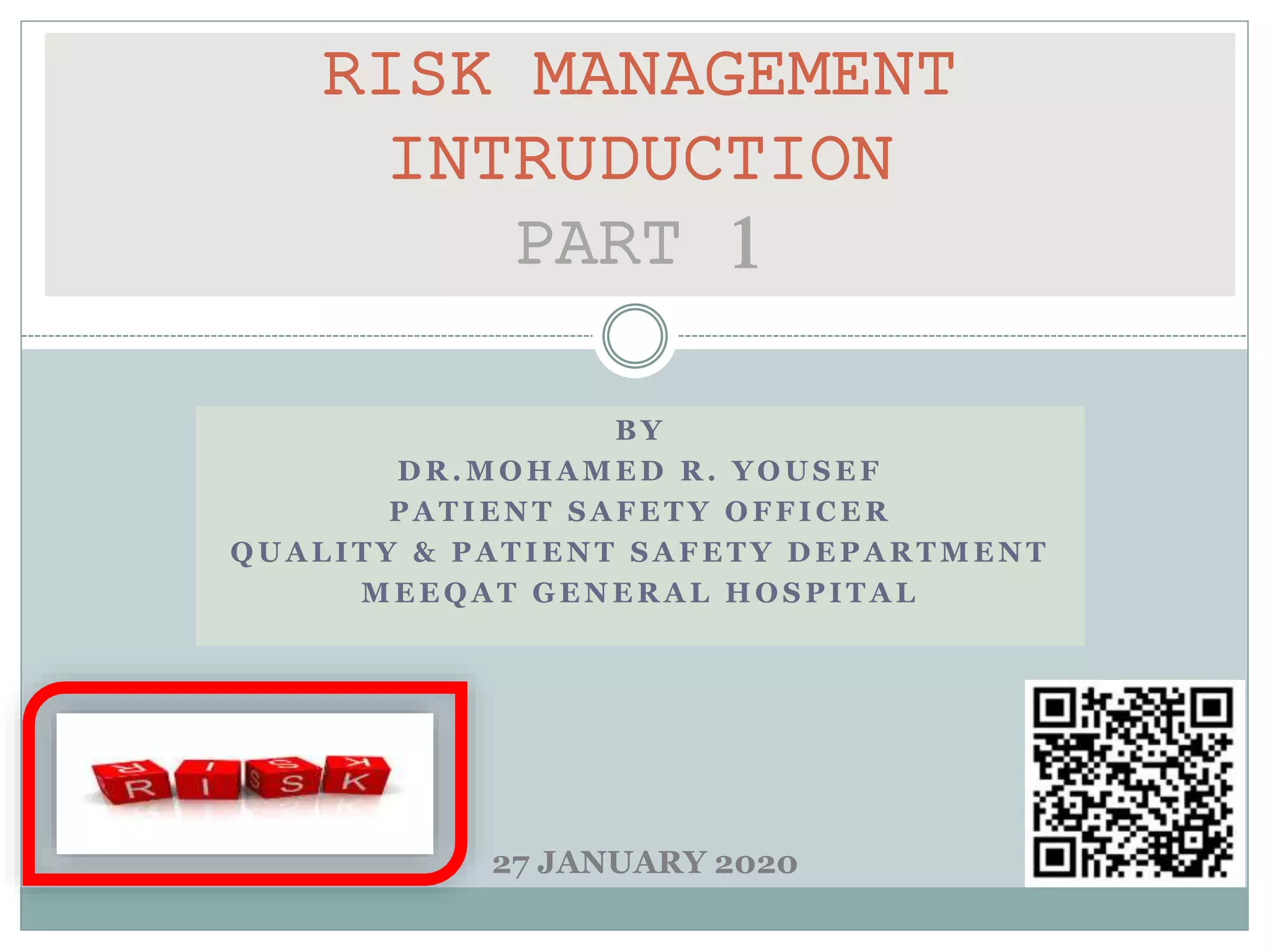 The document provides an overview of risk management in healthcare, defining risk and outlining its importance for patient safety and organizational integrity. It categorizes risks into several types, including operational, financial, human capital, strategic, legal, technology, and environmental hazards, and discusses expected outcomes for effective risk management. Additionally, it emphasizes the need for systematic identification and management of risks while adapting to changes in healthcare demographics and regulatory environments.