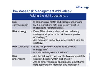 The document presents insights from Thomas C. Wilson, Chief Risk Officer at Allianz, on the importance and implementation of risk management practices. It outlines key questions related to risk strategy, communication, and controlling, emphasizing the need for transparency and governance in risk management processes. Additionally, it details the structure, frameworks, and challenges faced within Allianz's risk management, particularly in the context of changing market environments and regulatory requirements.