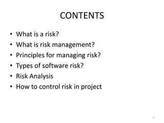 This document discusses risk management for software projects. It defines risk as the probability of suffering a loss and explains that risk management aims to reduce risks so the project can be delivered successfully to customers. The document outlines principles of risk management like taking a global perspective and continuous monitoring. It also categorizes types of software risks and describes the risk analysis process of identification, projection, assessment, and management through tools like risk tables. Finally, it presents the risk management paradigm of identifying, analyzing, planning, tracking, controlling, and communicating risks.