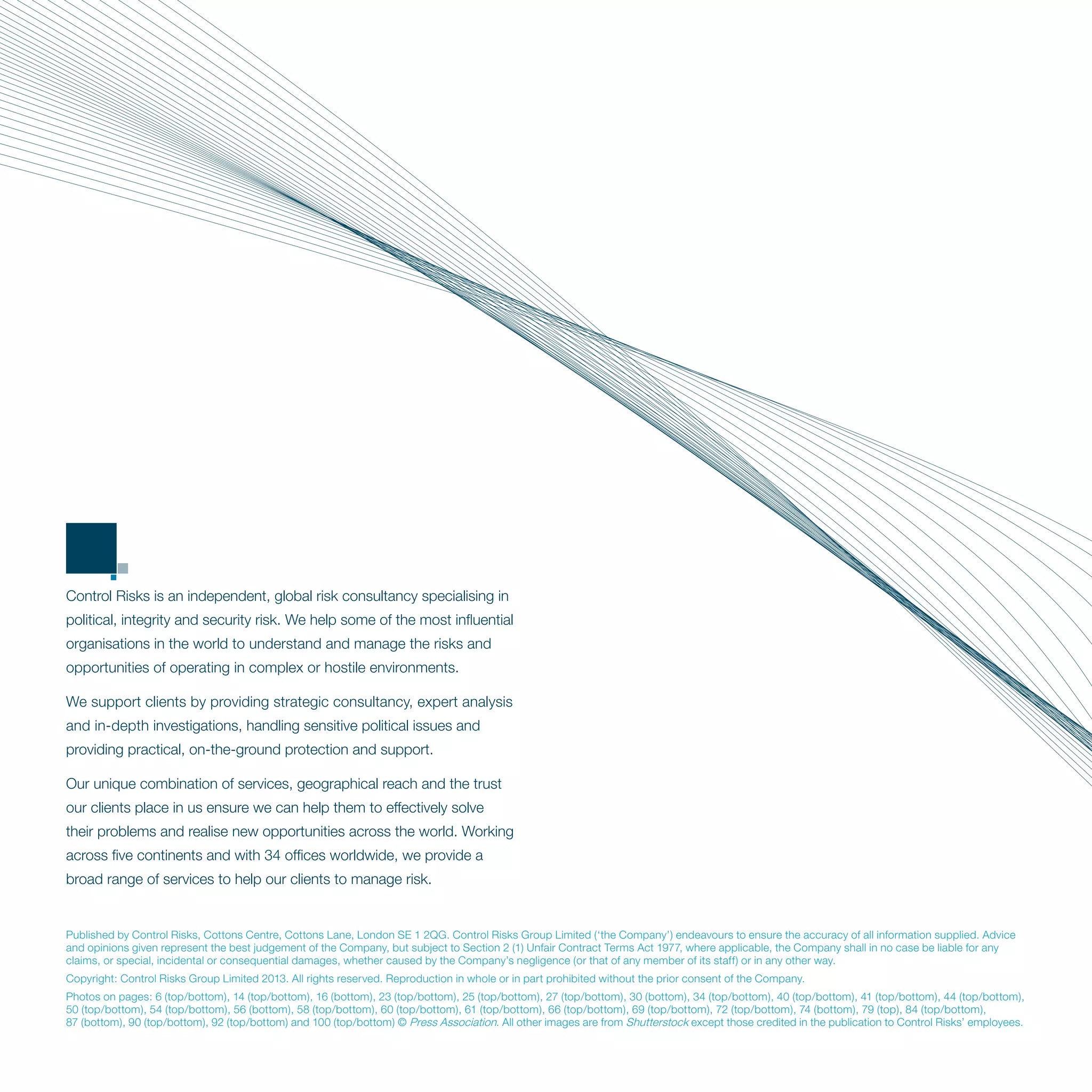 The document is a report by Control Risks titled "RiskMap Report 2014" that discusses major risks facing businesses in the coming year. It notes that as companies pursue increasingly complex global structures, they face new vulnerabilities from local issues. Local political and security risks can now rapidly spread and impact companies globally. Several major risks are highlighted for 2014, including slowing growth in emerging markets, ongoing conflicts in the Middle East, and election-related instability in some large economies like India and Brazil. The report argues that local political trends will be difficult for foreign companies to read as economic power shifts in many countries.