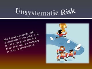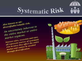Risk involves uncertainty about potential future problems or losses. It describes the variability in returns around an expected average outcome. There are several types of risk, including market risk from macroeconomic factors, purchasing power risk from inflation, interest rate risk for bond prices, and business risks from uncertainties like changes in tastes, competition or policies. Financial risk specifically refers to the possibility of sudden monetary losses related to financing.