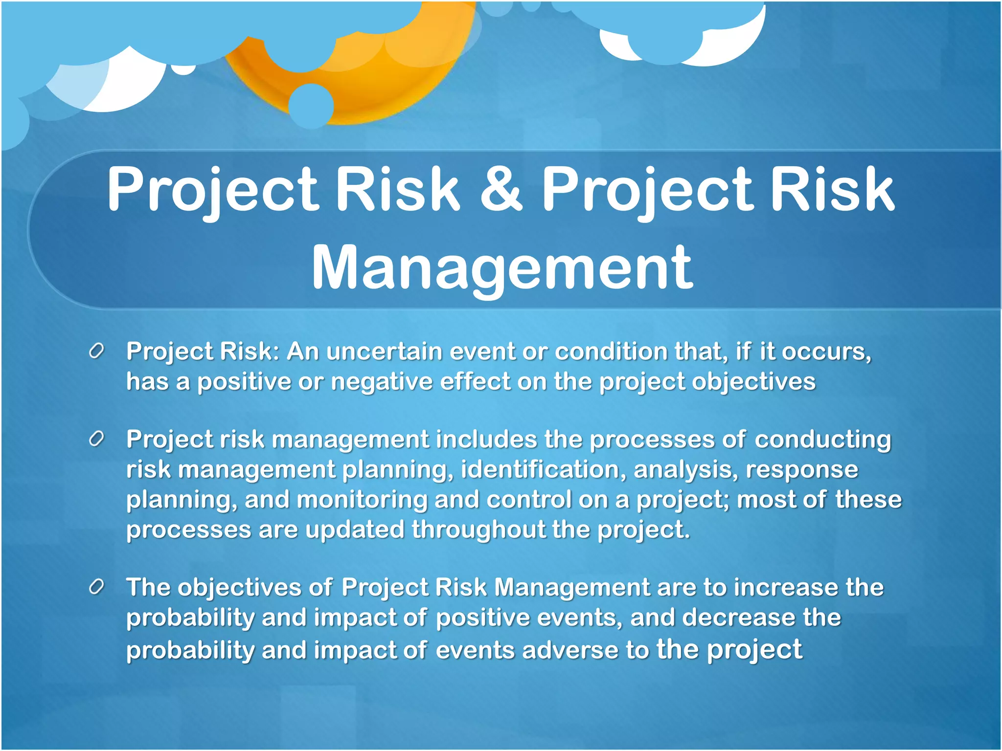 Project risk refers to uncertain events that can positively or negatively affect project objectives, necessitating effective risk management processes, including planning, identification, assessment, and monitoring. The document outlines a systematic approach to project risk management, detailing steps from risk planning to evaluation, and various strategies for responding to risks. Ultimately, it emphasizes the importance of understanding risks in relation to project constraints and stakeholder risk tolerances.