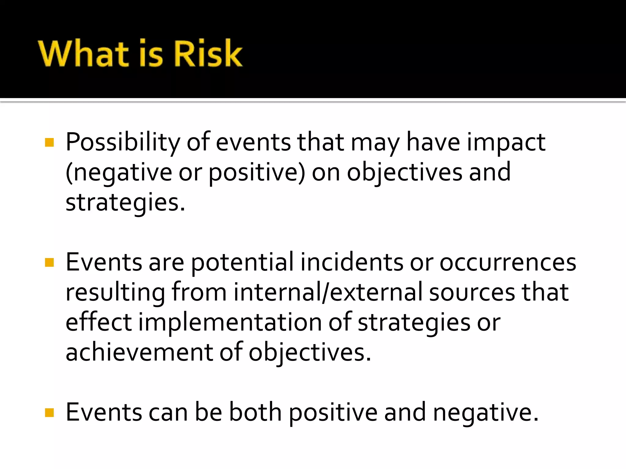 The document discusses various techniques for identifying risks, including flowcharts, organizational charts, questionnaires, checklists, physical risk inspections, and event inventories. Flowcharts and organizational charts can help locate areas of risk concentration and dependencies. Questionnaires are useful for collecting information from different staff but need to be designed carefully. Physical risk inspections allow assessing risks firsthand but are time-consuming. Event inventories examine past loss events to identify trends. The techniques have advantages and disadvantages, so a combination is often best to comprehensively identify risks.
