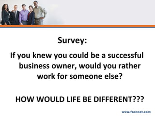 The document discusses various topics related to business ownership, including the risks and rewards, reasons people choose to work for others versus own their own business, and different options for becoming a business owner such as starting a new business, buying an existing business, or starting a franchise. It provides advice on how to reduce fear of failure, determine the right business model, develop short-term and long-term strategies, and suggests reading books like Rich Dad Poor Dad to help with researching business ownership.