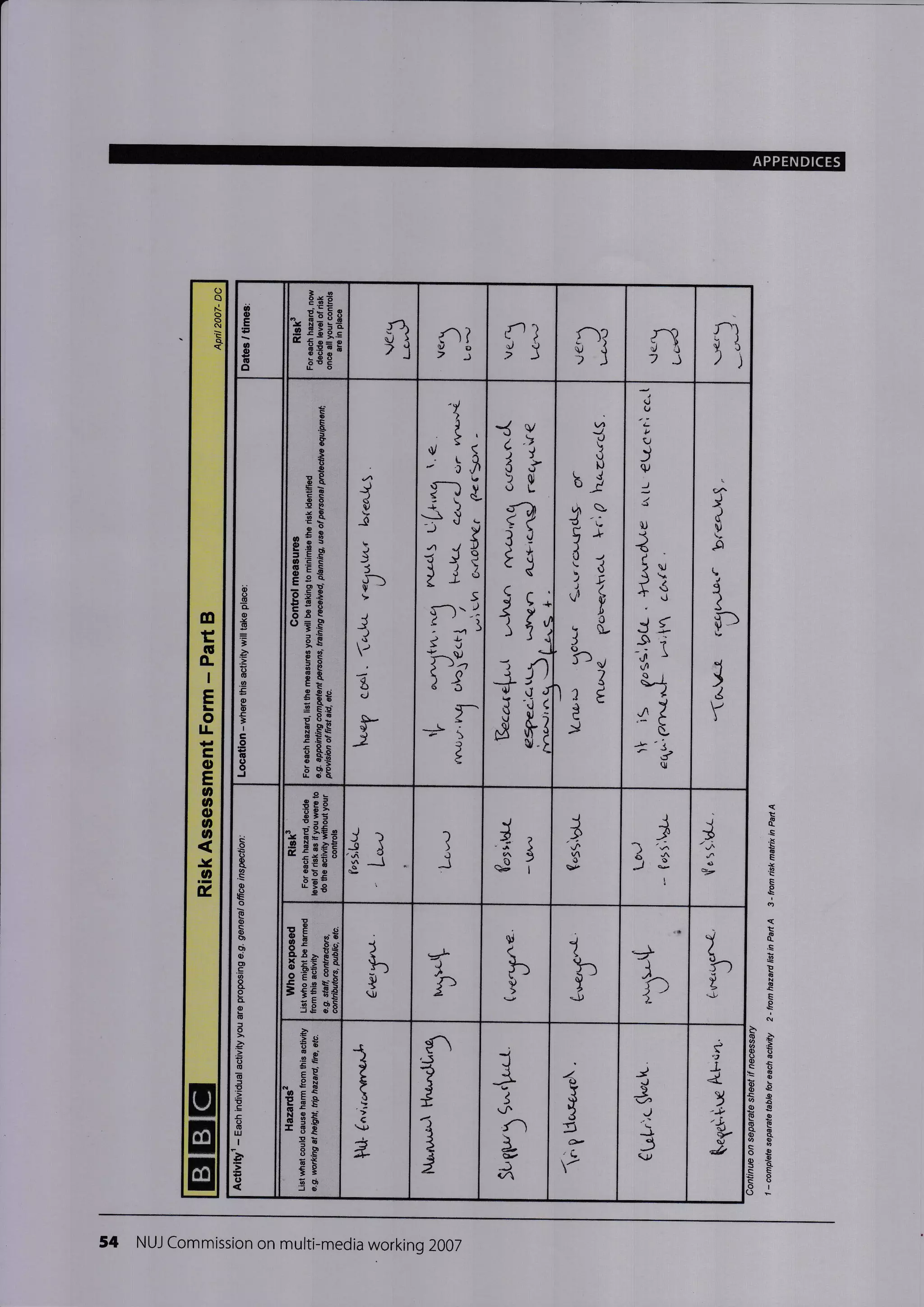 This document appears to be part of a BBC risk assessment form. It includes sections for general information about the risk assessment, hazards to consider, and a risk matrix to determine the level of risk based on the likelihood and severity of potential harm. The form would be used to identify any risks associated with a BBC activity or production and ensure appropriate safety measures are in place.