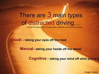 There are three main types of distracted driving: visual, manual, and cognitive. Texting involves all three as it requires drivers to take their eyes off the road, hands off the wheel, and mind off driving. Studies show texting deteriorates reaction time more than driving drunk. Despite this, 81% of drivers still text while driving due to multitasking, addiction to their phones, and being oblivious to the dangers. Fines for distracted driving are increasingly common but have not significantly reduced the statistics as many drivers are not afraid of getting caught.