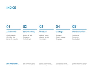 Il documento presenta una strategia di social media per promuovere l'iniziativa educativa 'Mercoledì Riso', sviluppata da studenti del master in comunicazione, web marketing e pubblicità presso l'Università Cattolica del Sacro Cuore di Milano. L'obiettivo principale è aumentare la consapevolezza del brand Riso Acquerello e il coinvolgimento nelle scuole, attraverso contenuti didattici ludici. La strategia si basa su un piano editoriale che combina analisi di mercato, obiettivi macro e specifici, e utilizzo di diverse piattaforme sociali.