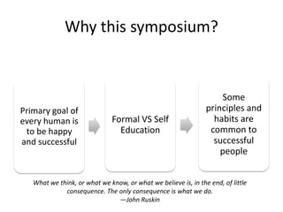 The document provides principles and habits for success based on a symposium by Ritesh Malik. It discusses focusing on action over thinking, networking with successful people, and committing to constant self-improvement. Key habits include prioritizing tasks, taking accountability, delaying gratification, and investing in health, skills, and positive relationships. The overall message is that excellence comes from establishing habits like these, rather than relying on luck or destiny.