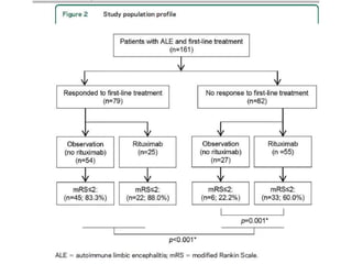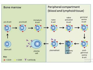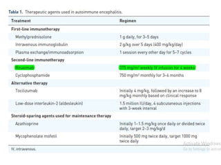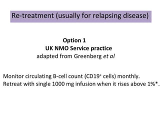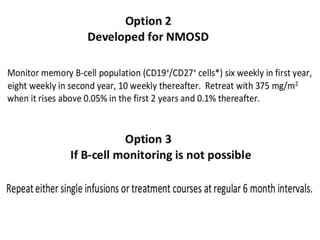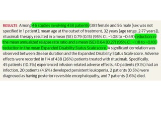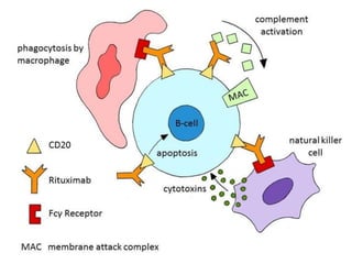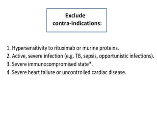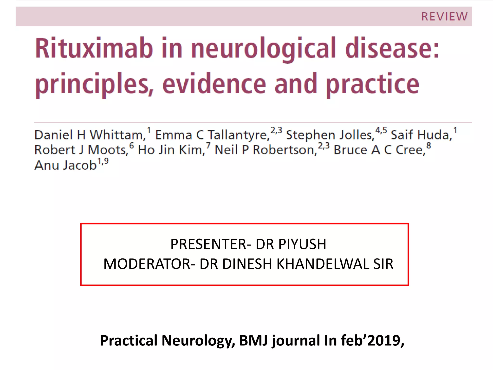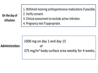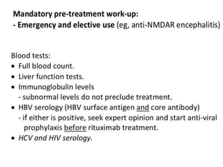 Rituximab is a monoclonal antibody that targets B cells. It is used to treat various neurological conditions associated with autoantibodies or B cell dysfunction, including refractory myasthenia gravis, NMOSD, autoimmune encephalitis, and relapsing MS. The document discusses B cell biology, mechanisms of action of rituximab, indications, dosing, efficacy evidence, risks and monitoring considerations for rituximab's use in neurology. Key risks include infusion reactions and secondary infections due to prolonged B cell depletion.