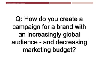 The document presents a strategy for The Ritz-Carlton aimed at defining and appealing to the global affluent customer, characterized by shared values such as mobility, success, status, networking, and consumption. It emphasizes disrupting traditional hotel norms by focusing on creating lasting memories and connections with guests, rather than just a transient stay experience. The brand seeks to engage customers through multi-platform storytelling and a unified approach, highlighting the importance of community and shared experiences.