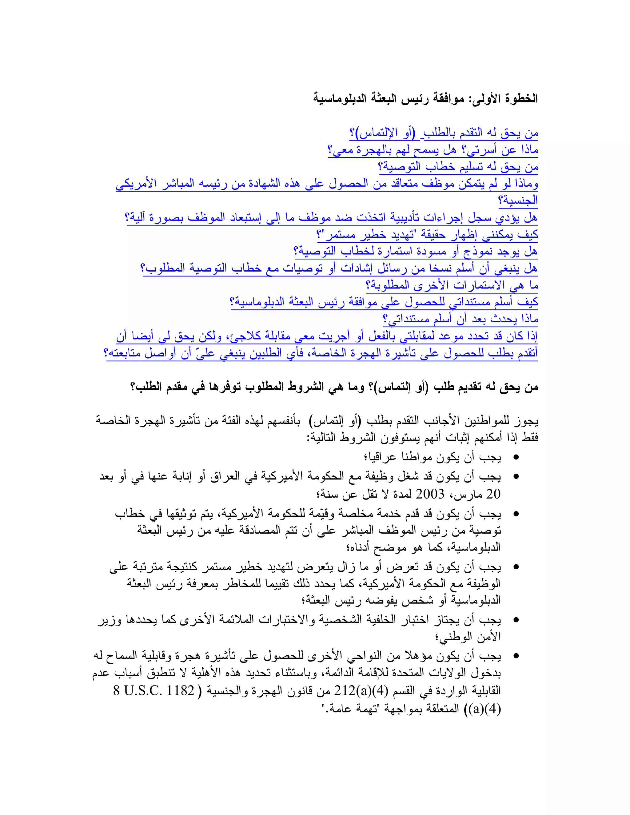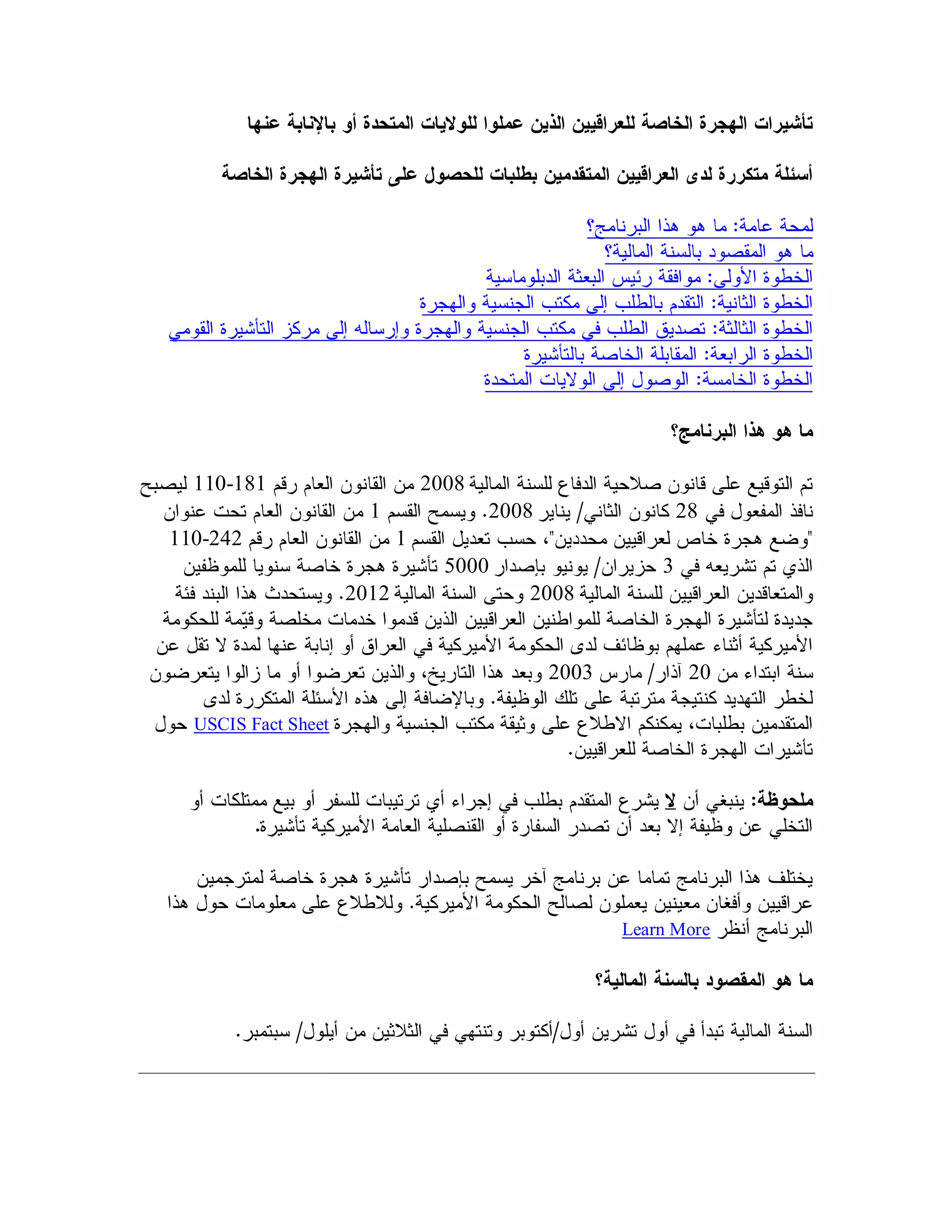 The document provides information related to the special immigrant visa (SIV) application process for Iraqis, including various forms and contact details for relevant agencies. It outlines the petitioning process and includes links to immigration resources, frequently asked questions, and specific email addresses for assistance. The document serves as a guide for individuals seeking SIV status and details requirements and supporting documents needed.