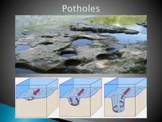 The document details the characteristics and processes of rivers, including their longitudinal profiles, methods of erosion like hydraulic action, attrition, and corrosion. It explains the formation of various landforms, such as valleys, gorges, canyons, and waterfalls, resulting from water flow and geological factors. Additionally, it discusses sediment transport and depositional features like alluvial fans, cones, and deltas.