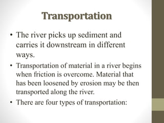 The document discusses the process of sediment transportation in rivers, highlighting that it begins when friction is overcome by loosened material from erosion. It details four types of transportation: traction, saltation, suspension, and solution, each varying in location and method along the river. These processes are essential for understanding sediment movement from the source to the mouth of the river.
