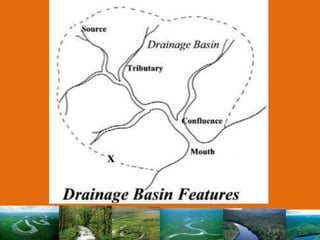 River discharge is affected by physical and human factors in the drainage basin. The physical size and characteristics of the drainage basin, including rock and soil permeability, vegetation cover, and relief or slope, determine how much water runs off into the river channel from precipitation events. Human activities like urbanization and deforestation can increase surface runoff, while dams can regulate river flow. Flood hydrographs show how river discharge responds to rain, with peaks in flow and lag times between precipitation and flooding influenced by drainage basin properties.