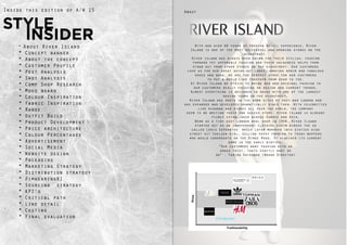 River Island is a British multinational clothing retailer known for its stylish yet affordable fashion. The document proposes creating a premium menswear collection called River Island X that would offer higher quality garments at a slightly higher price point. It would feature collaborations with designers and celebrities to attract new customers and excitement. An initial collection done in partnership with Kanye West is suggested, featuring trend-forward fabrics like neoprene at premium prices. Extensive market research on competitors, trends, target customers and a financial analysis is presented to argue this collection could be successful for River Island.