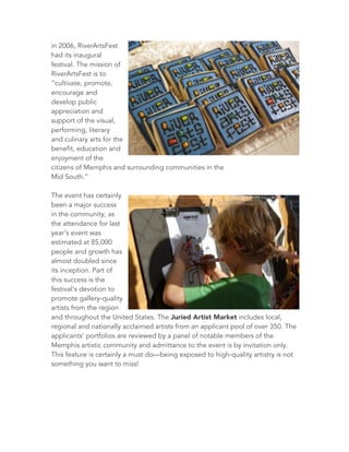 The RiverArtsFest is a annual arts festival held in Downtown Memphis each October. It features visual art from over 350 juried artists, live musical performances on three stages, hands-on art activities for children, and food and drink from local vendors. The festival aims to promote appreciation of the arts in Memphis and surrounding communities. Last year's event attracted an estimated 85,000 people.