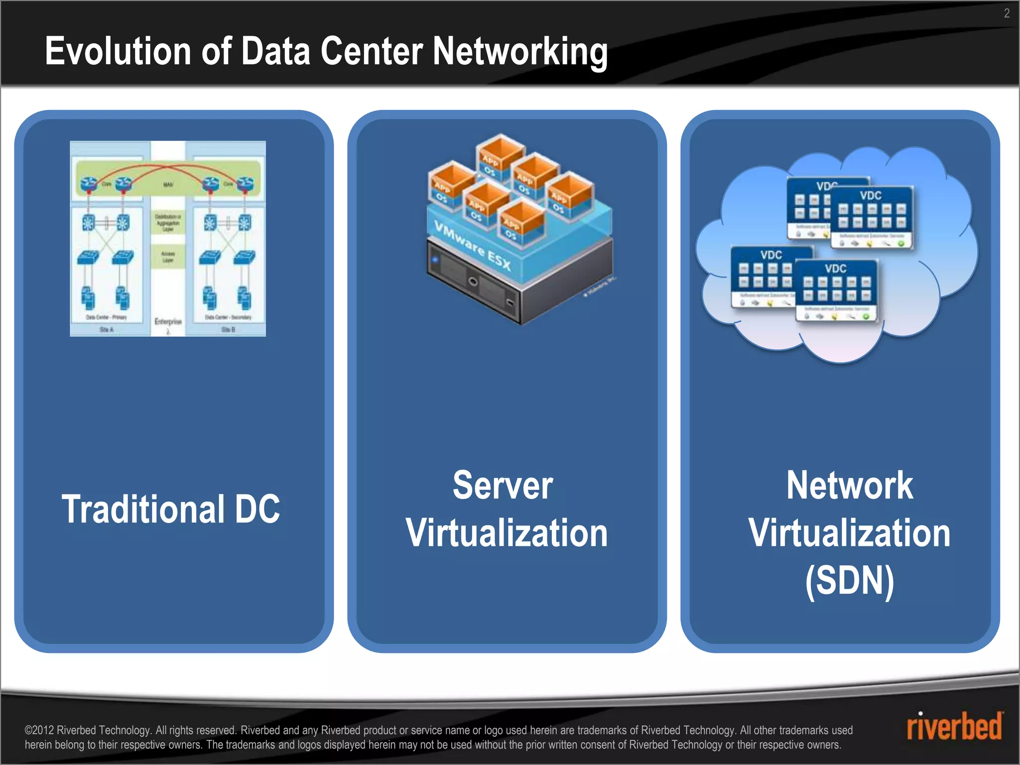 The document discusses performance management for virtualized data centers, emphasizing the integration of application performance management (APM) and network performance management (NPM) through Riverbed's Cascade solution. It highlights the challenges of visibility and control in software-defined networking and virtualized environments, particularly with VXLAN overlay networks. It also outlines the partnership between Riverbed and VMware to enhance performance management in cloud-based infrastructures.