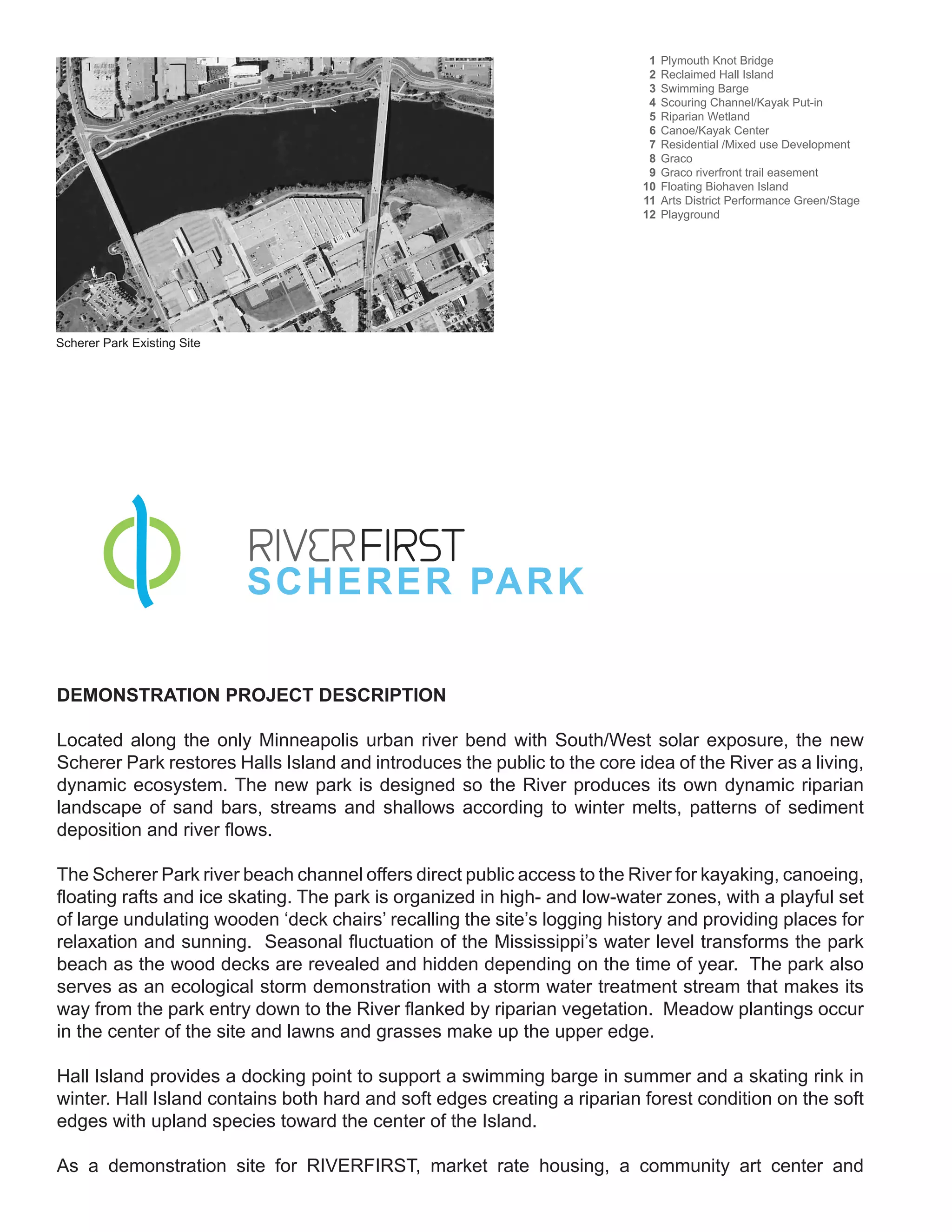 The Wetlands demonstration project would restore degraded wetlands along the Mississippi River and introduce public access. Key elements include: