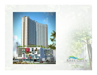 Rivergreen Residences is a 340-unit residential condominium located along the historic Pasig River offering residents a peaceful riverside living. The development features 25 storeys with residential units on floors 6-26, commercial units on the ground floor, and parking from floors 3-5. It is located close to public transportation, schools, churches and commercial areas. The building amenities include a gym, pool, and WiFi access providing residents a convenient lifestyle.