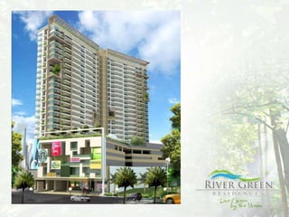 River Green Residences is a 25-storey residential development located along the historic Pasig River offering 330 units in the South Tower and 312 units in the North Tower. The development will include commercial units on the ground floor, a supermarket on the 2nd floor, and amenities such as a gym, pool, and WiFi on the 6th floor. Units range from studio to 2-bedroom layouts and start at PHP 1.3 million with flexible payment options. The project aims to provide an accessible yet tranquil living space connected to the city and nature.