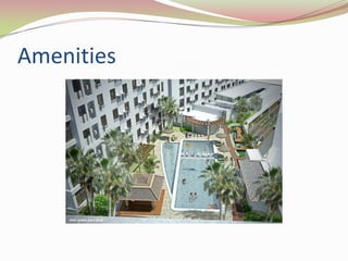 Rivergreen Residences is a 25-storey building with 340 residential units, 14 commercial units, and 254 parking slots. It has 2 passenger and 2 service elevators for residents and 1 freight and 1 service elevator for commercial units. The document provides details on unit sizes, floor and wall finishes, and financing terms for potential buyers.