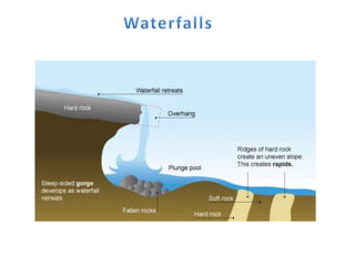 3) Practice questions are provided about river features and processes like waterfall formation. Diagrams and explanations of answers are given.