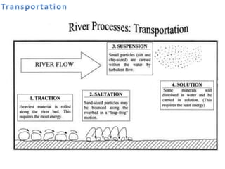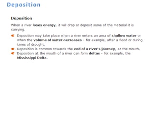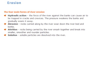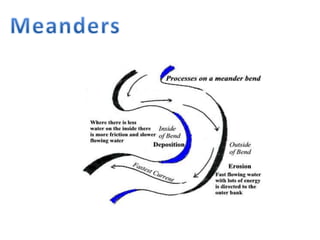 1) It discusses the hydrological cycle and river landforms like meanders, ox-bow lakes, and deltas. Biological, freeze-thaw, and chemical weathering are explained.