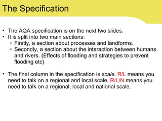 The document provides information about river processes and landforms, including a case study of the River Tees in England. It discusses the different features formed by erosion and deposition in the upper, middle, and lower courses of the river. These include waterfalls, meanders, ox-bow lakes, levees, and deltas. It also describes human interactions with rivers, including river management through strategies such as dredging, flood prevention schemes, and the use of dams and reservoirs. The case study of the River Tees illustrates these concepts and shows how the river has been developed for industry, housing, and ports in its lower course.