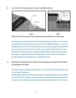 3) The second question addresses how waterfalls can form from differences in rock resistance leading to changes in river gradient, or from faulting and displacement of rocks.