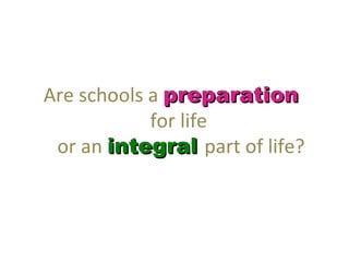 1. It questions whether schools should prepare children for life or be an integral part of life.