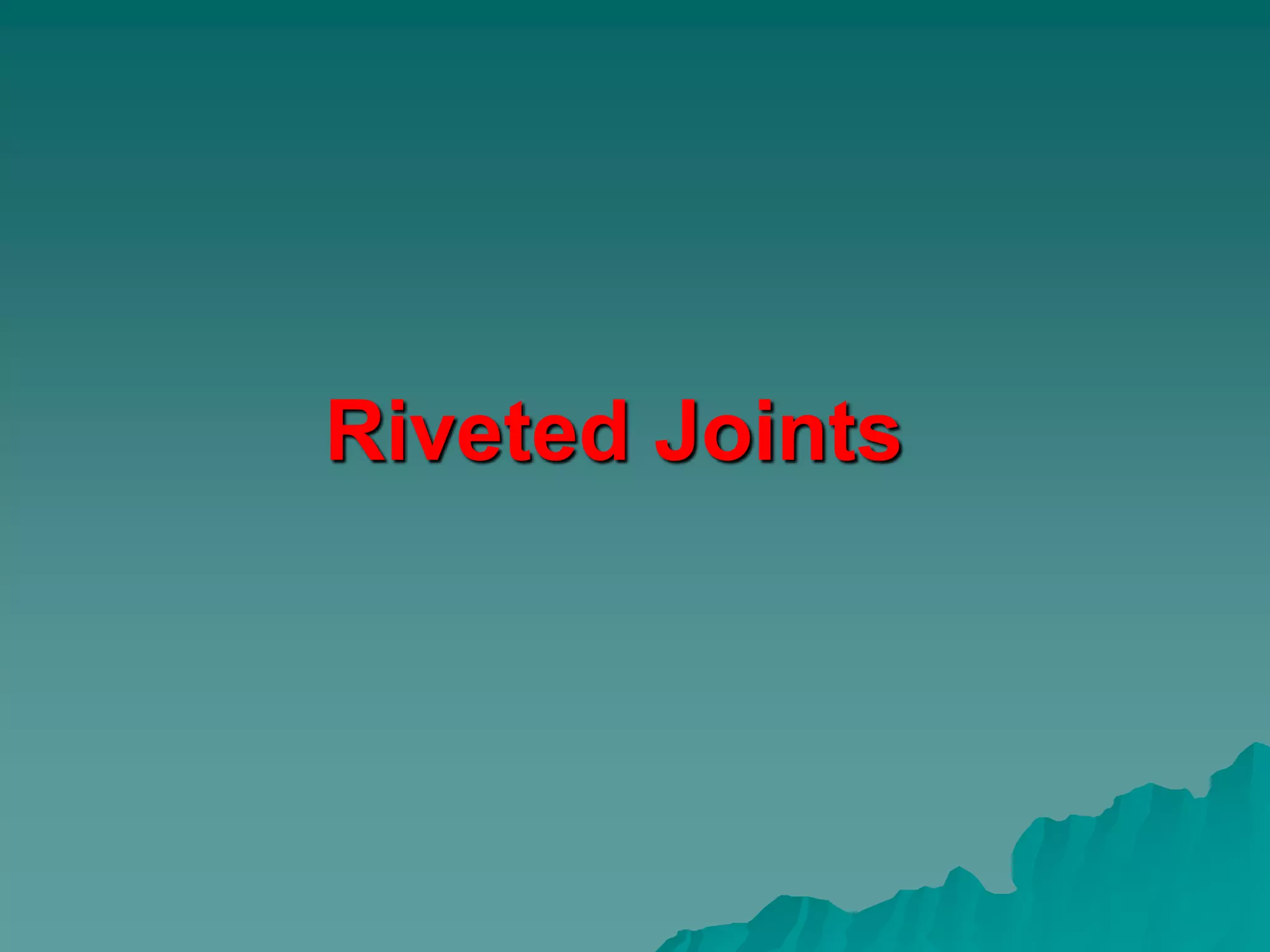This document summarizes riveted joints, including their applications, components, types, and failure modes. Riveted joints are used to connect parts in pressure vessels, bridges, ships, airplanes, cranes, and buildings. A rivet consists of a head and shank. When forming a joint, rivets are inserted through holes in plates and the protruding end is hammered to form a second head. Common rivet materials include steel, nickel steel, brass, and aluminum. Key types of riveted joints are lap joints and butt joints. Failure can occur via bending of rivets or plates, shearing of rivets, crushing of rivets or plates, or rupture of