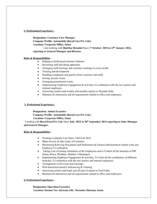 Riya Dutta is seeking a professionally challenging position utilizing her 5 years of experience in customer service and administration roles. She has worked as a Sales Quality Manager, Customer Care Manager, Admin Executive, and Operations Executive for automobile companies. Her responsibilities have included resolving customer complaints, training employees, administrative tasks, and account management. She holds an MBA in HR, Post Graduation in Commerce, and various computer and accounting qualifications.