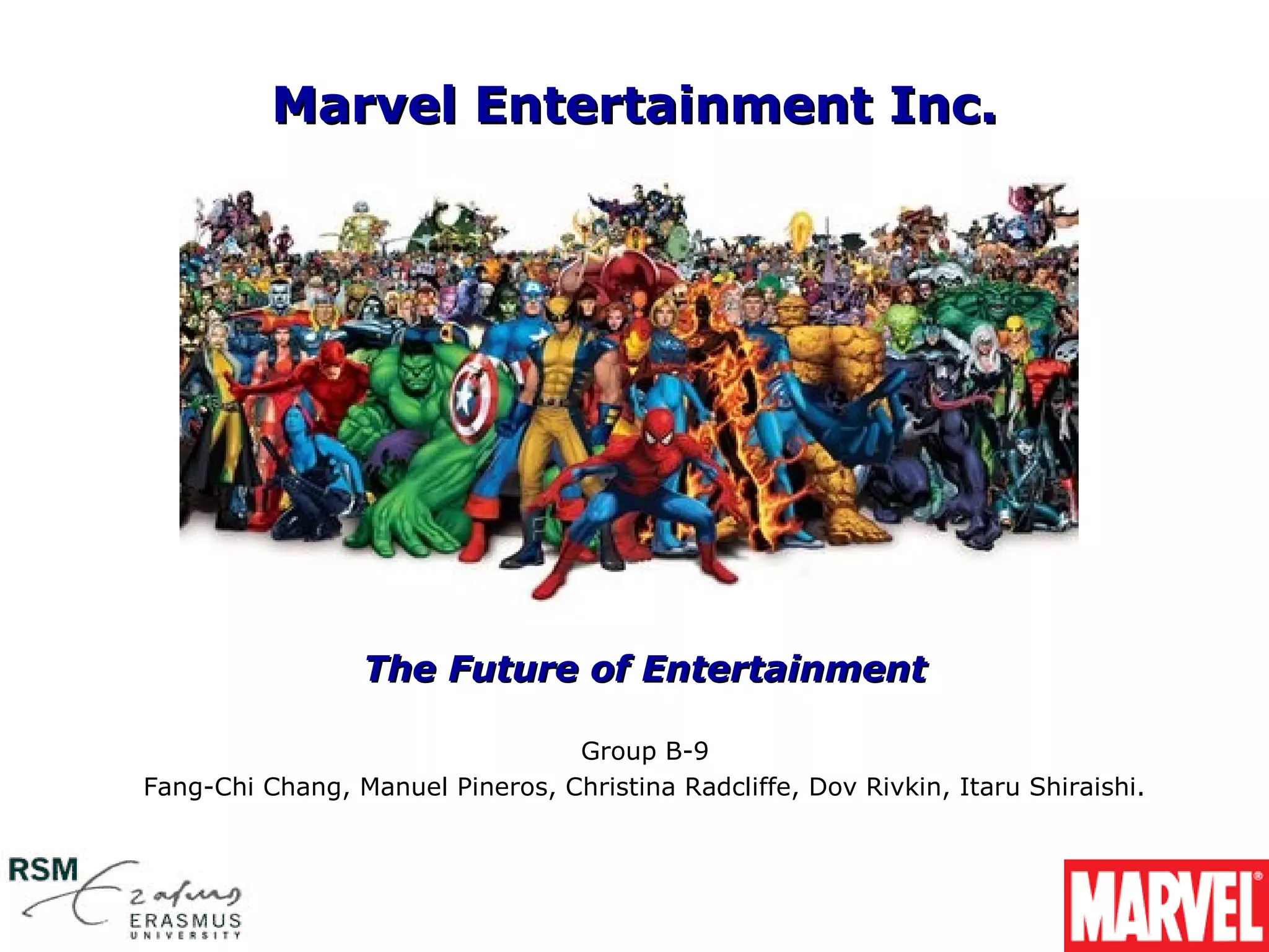 Marvel Entertainment Inc. presents on the company's current business model, lines of business, and opportunities for future growth. The core of Marvel is its intellectual property portfolio of characters. Currently, Marvel generates most of its revenue and high margins through licensing these characters. Management sees opportunities to expand internationally, through partnerships like Hasbro for toys and Marvel Studios for films, and by leveraging the online community. Marvel also has free cash flows that could be used to acquire other companies or pay dividends.