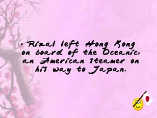 From February 28 to April 13, 1888, Rizal traveled to Japan, meeting key figures like Juan Perez Caballero and O-sei-san, a samurai's daughter. He accepted Caballero's invitation to stay at the Spanish legation, partly to cut living expenses and avoid scrutiny from Spanish authorities. Rizal was impressed by Japan's scenic beauty, cleanliness, and the politeness of its people, while his romantic connection with O-sei-san helped him cope with past heartbreak.