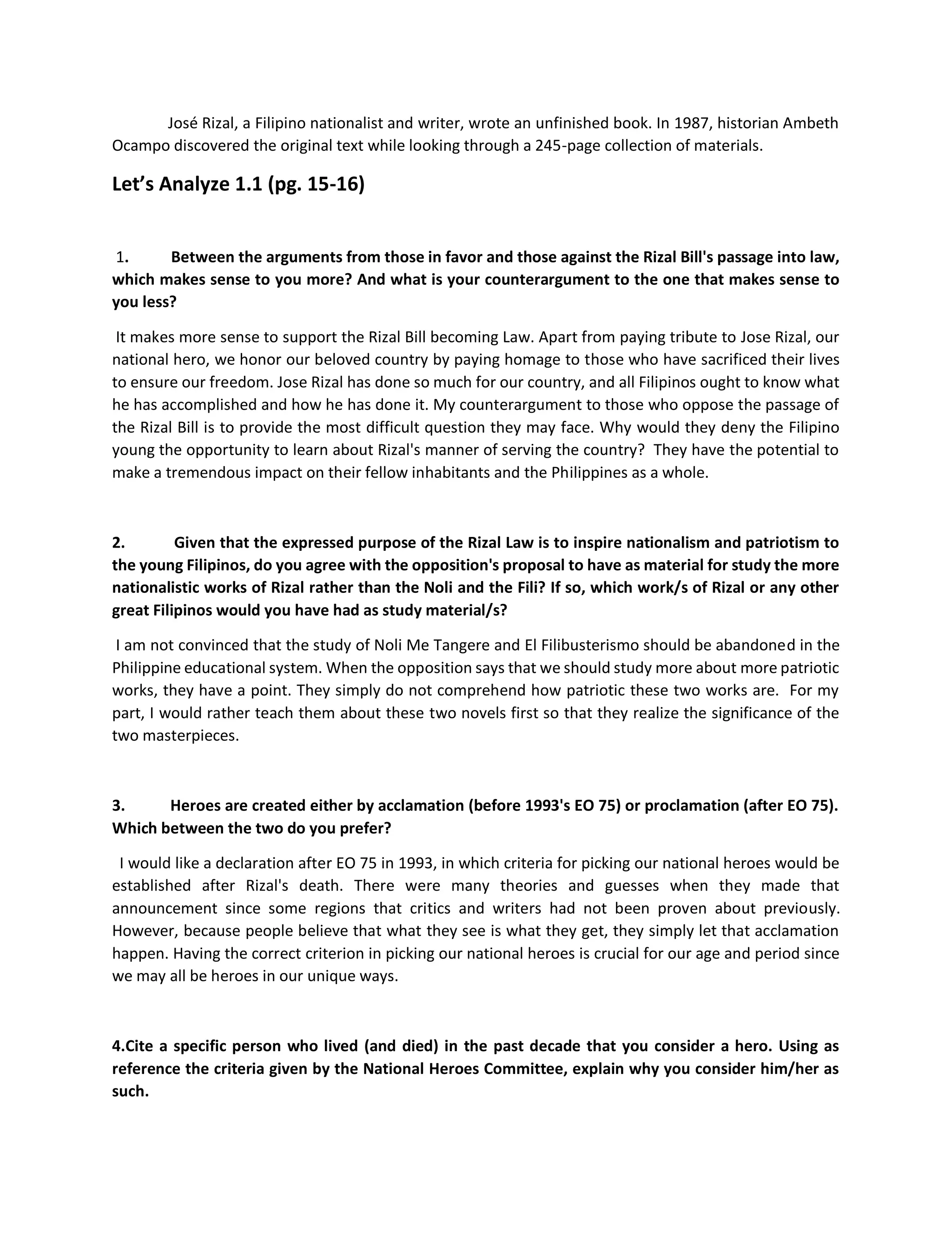 2. An activity analyzing arguments for and against the Rizal Bill, and consideration of which works of Rizal should be studied to inspire nationalism.