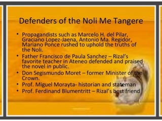 Rizal cannot be considered ignorant as alleged by Fr. Rodriguez, since he was well-educated in Spanish and received scholastic honors. In the Noli Me Tangere, Rizal did not attack the church or Spain itself, but rather criticized corrupt Spanish officials and friars, not the institutions. Fr. Rodriguez claimed reading the novel was a mortal sin, but since he read it himself, he too must have committed the same sin according to his own standard.