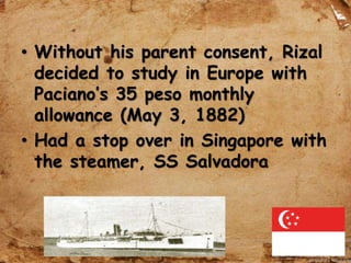Rizal decided to study abroad in Europe without his parents' consent. He traveled to Singapore and then continued on to locations like Ceylon, Aden, Italy, France, and Spain. In Spain, he studied medicine and philosophy and was involved in writing and political activism. He experienced hardship but also made important connections. He later traveled throughout Europe including to Germany where he did further study and research, worked in medical clinics, and wrote his first novel which inspired political change.