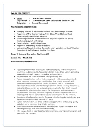 The document is a curriculum vitae for Ahmed Rizwan, an Accountant based in Abu Dhabi, UAE. It outlines his educational qualifications including a B.Com degree, work experience including roles as a General Accountant and Business Development Executive, computer skills in Tally ERP 9 and Microsoft Office, and languages spoken including English, Hindi, Arabic, and Malayalam. It expresses his career objective of seeking a challenging role utilizing his qualifications and experience.