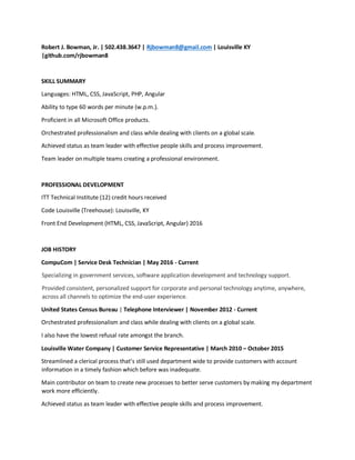 Robert J. Bowman Jr. has over 15 years of experience in customer service and technology support roles. He has strong skills in HTML, CSS, JavaScript, PHP, Angular and Microsoft Office products. Throughout his career, he has consistently led teams to success through his effective people and process improvement skills. Currently, he works as a Service Desk Technician at CompuCom specializing in government services, software development and technology support.